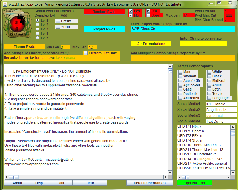 pwdFactory is a predictive linguistic, behavioral/Social Media Analyzer based password generator for conducting online dictionary attacks. It uses six different algorithms I wrote, each with varying modes and levels of predictive linguistic, behavioral complexity the user can adjust using level 1-5. These algorithms are used to drive five options.